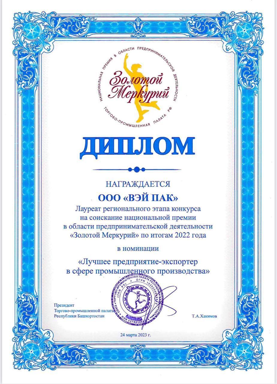 Резидент индустриального парка, компания «Вэй Пак» стала лауреатом регионального этапа конкурса на соискание национальной премии в области предпринимательской деятельности «Золотой Меркурий» по итогам 2022 года в номинации «Лучшее предприятие-экспортер в сфере промышленного производства».